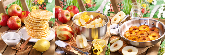 - Reibekuchen mit karamellisierten Apfelscheiben und Apfelmus servieren.
